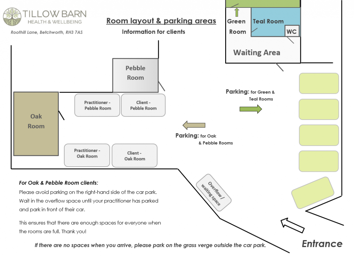 Please park on the left side of the car park, against the wooden fence on the left and in front of your therapist's car. The Oak Room is in the wooden building directly in front of you.